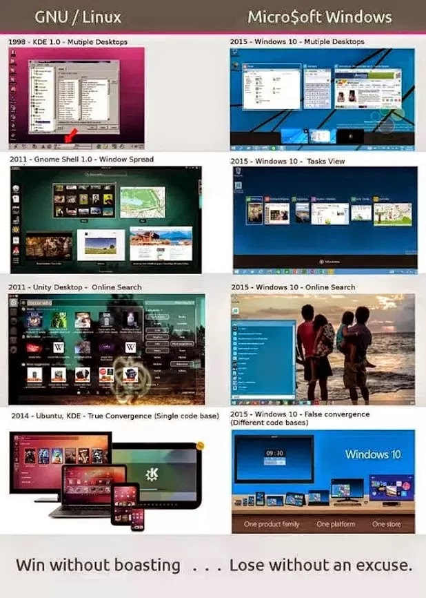 Hablando en serio y siguiendo con el tema, más bien, desde que Microsoft comenzó a mostrar algunos puntos de Windows 10 -cuando todavía era el 9, hablamos de finales del año pasado- han aparecido artículos aquí y allá resaltando que las novedades más destacadas de la nueva versión tienen su origen a este lado del parque tecnológico. Artículos que ante las noticias de las últimas semanas se han ido intensificando por eso mismo les dejo un detalle de imágenes comparativas que hablan por si solas!!!