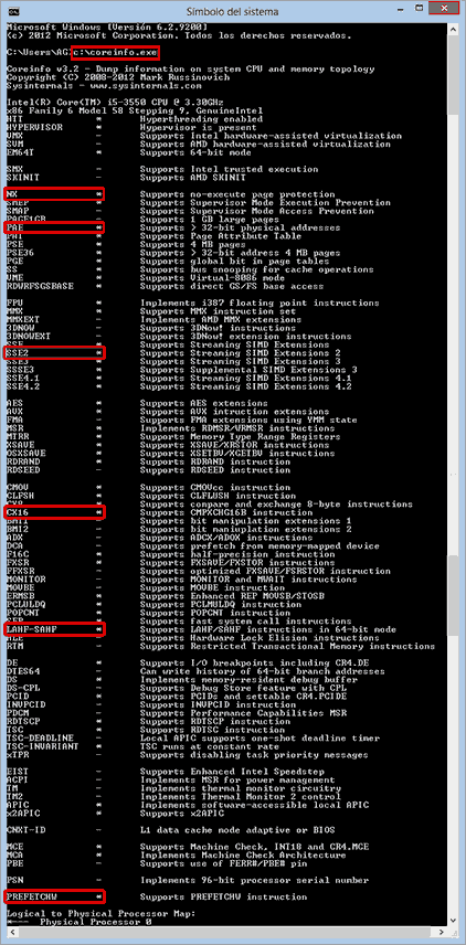 Tu CPU debe admitir TODOS los parámetros necesarios. Debe salirte un asterisco junto a NX, PAE y SSE2 para poder instalar la versión de 32 bits. Y además un asterisco a la derecha de PrefetchW, LAHF-SAHF y CX16 si pretendes instalar la de 64 bits.