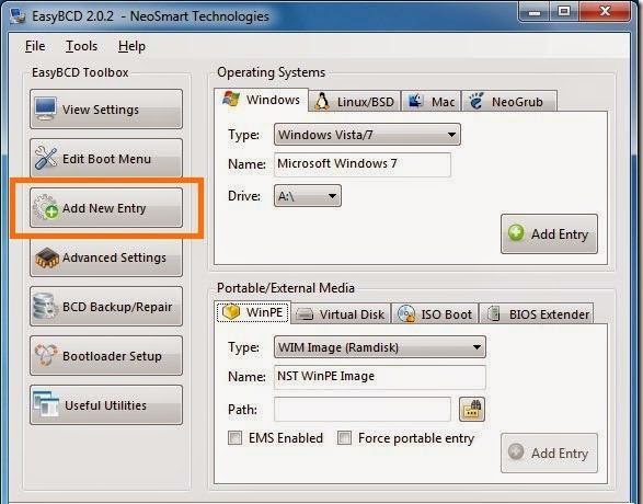 4 . En el lado izquierdo, haga clic en Add New Entry botón. Bajo la caja de medios portátil / externa, cambie a la pestaña de WinPE. En este caso, seleccione el tipo como imagen WIM y escriba un nombre para la nueva herramienta Reparación de inicio. Después, usted necesita para buscar el archivo de imagen WIM se encuentra en la carpeta donde extrajo la ISO Reparación de Windows.
